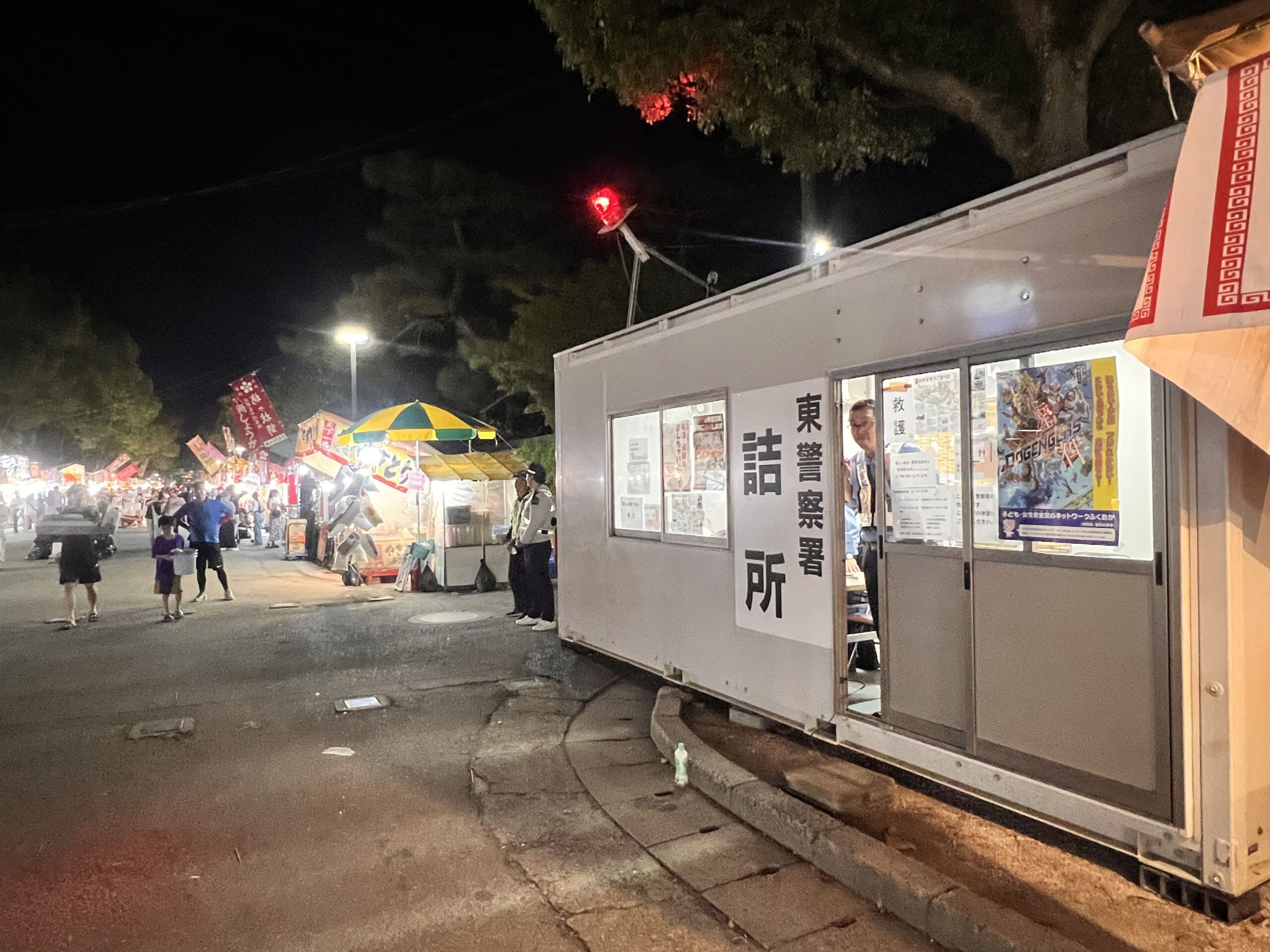 放生会期間中、境内には警察官の皆さんが常駐する詰所が設置されます。照明、電源、そして空調まで含めた電気設備を整備しました。